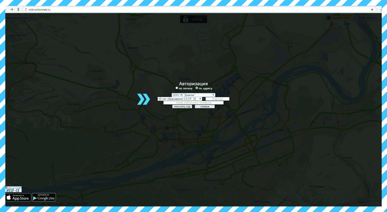4) Введите полученный вами код авторизации. Нажмите кнопку: "Войти". В открывшемся окне появится интерфейс просмотра камер вашего района;